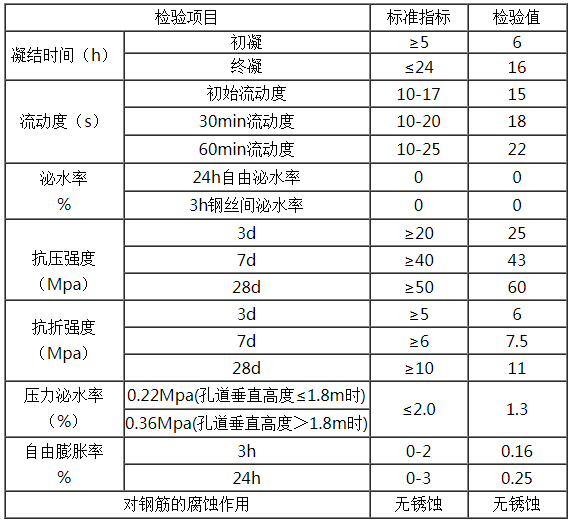 1.流动性好,初始流速小于17s,无收缩、自密实、强度高,不泌水、不分层。