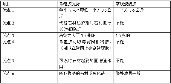 5.涂胶要求:背覆胶要一次涂满,不要有漏刷的地方,否则要间隔12小时再涂刷第二遍。涂刷的石材必须是裸石。(未经防护剂处理的石材)